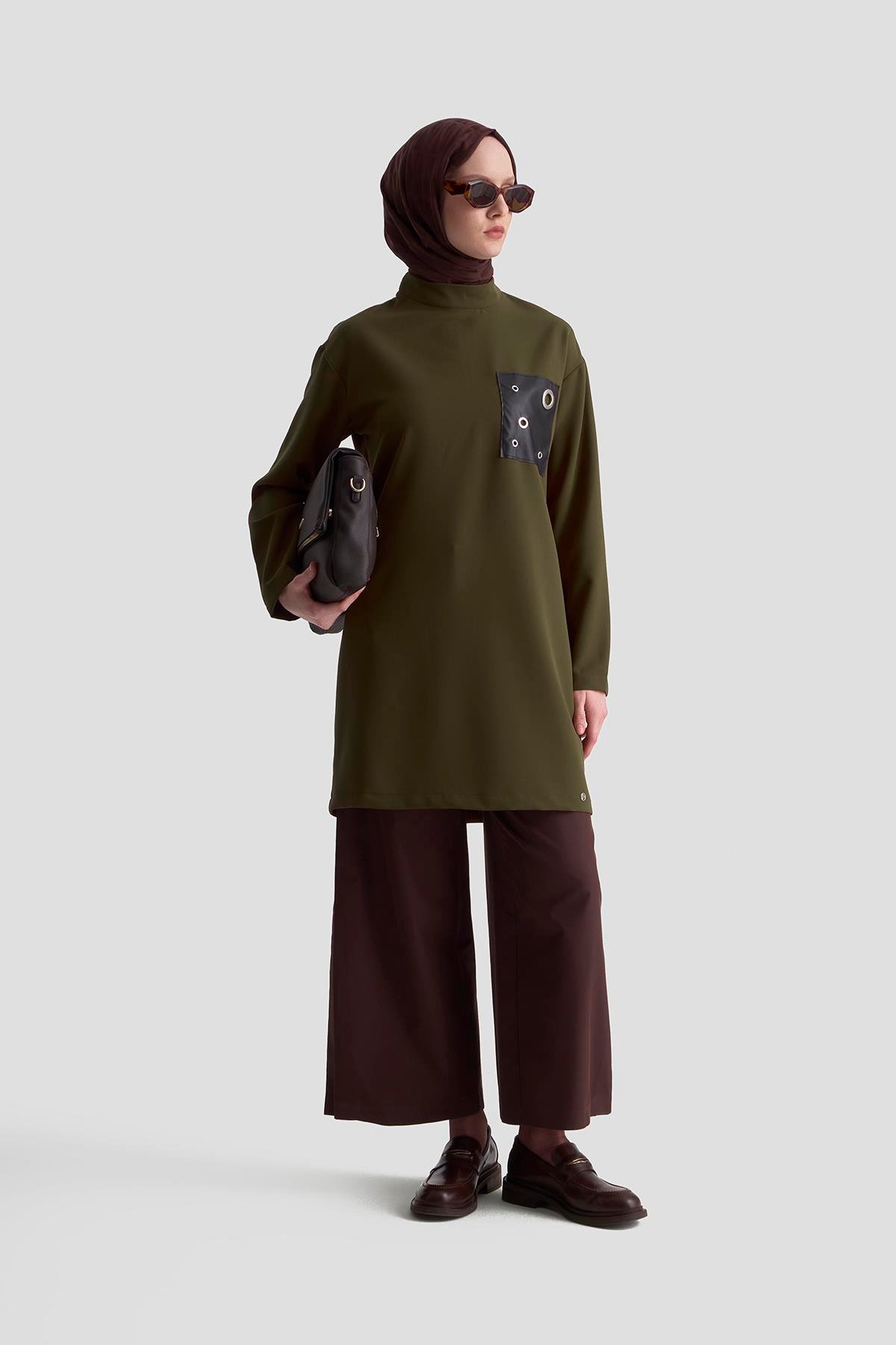 ARMİNE TREND Deri ve Kuşgözü Detaylı Tunik Yağ Yeşili 25KT438
