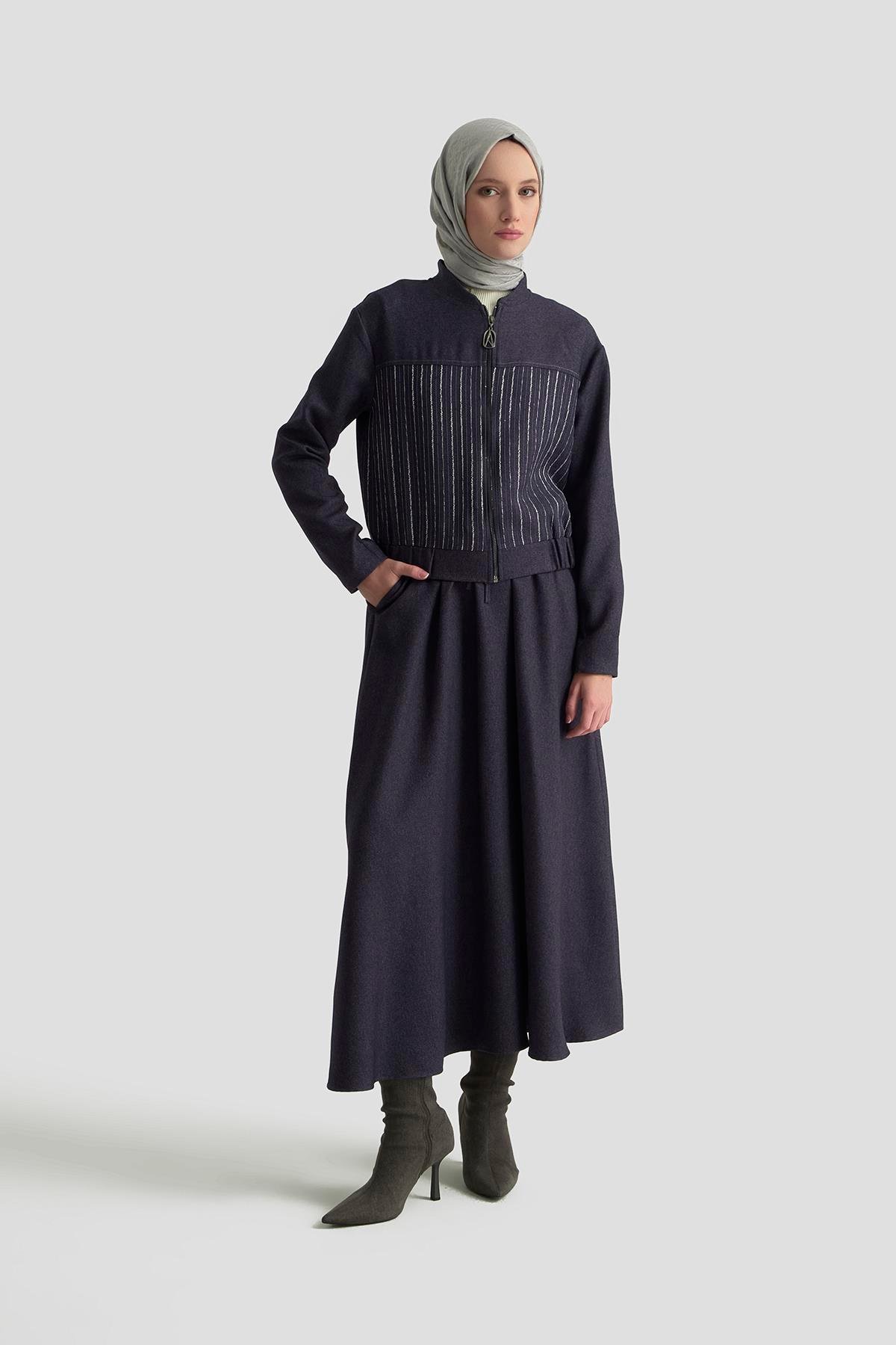 ARMİNE TREND Dokuma Çizgi Payet Garnili Etekli İkili Takım Lacivert 25KT663