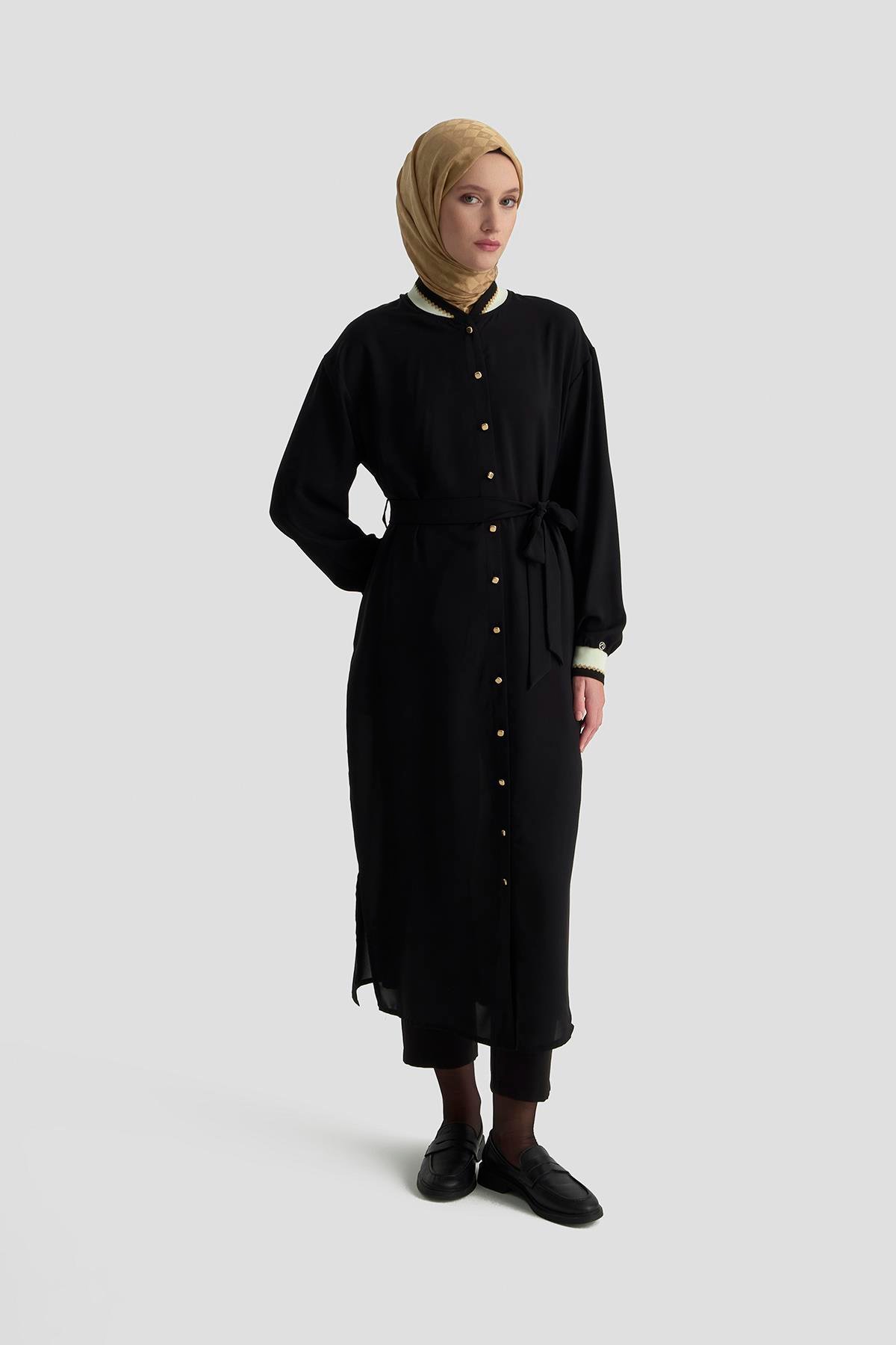 ARMİNE TREND Gold Düğmeli Kolları ve Yakası Ribanalı Beli Kuşaklı Tunik Siyah 25YT410