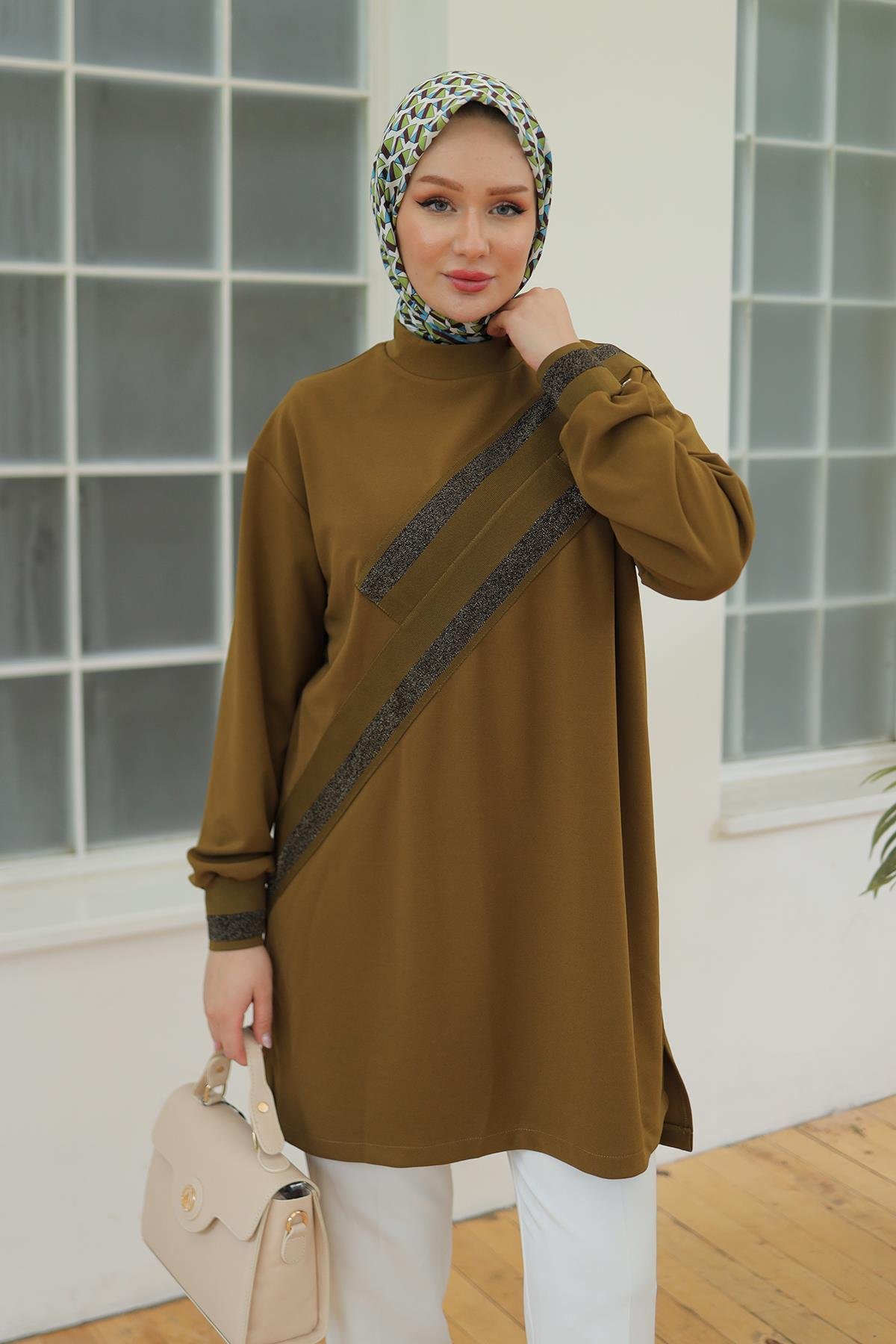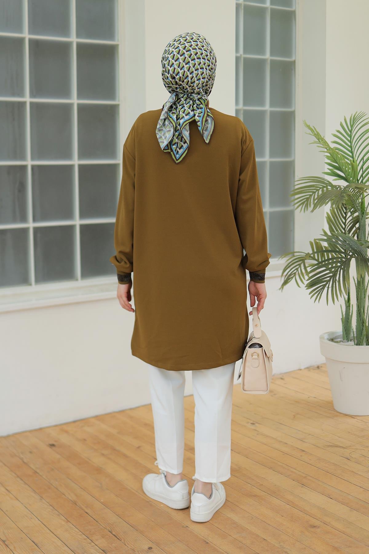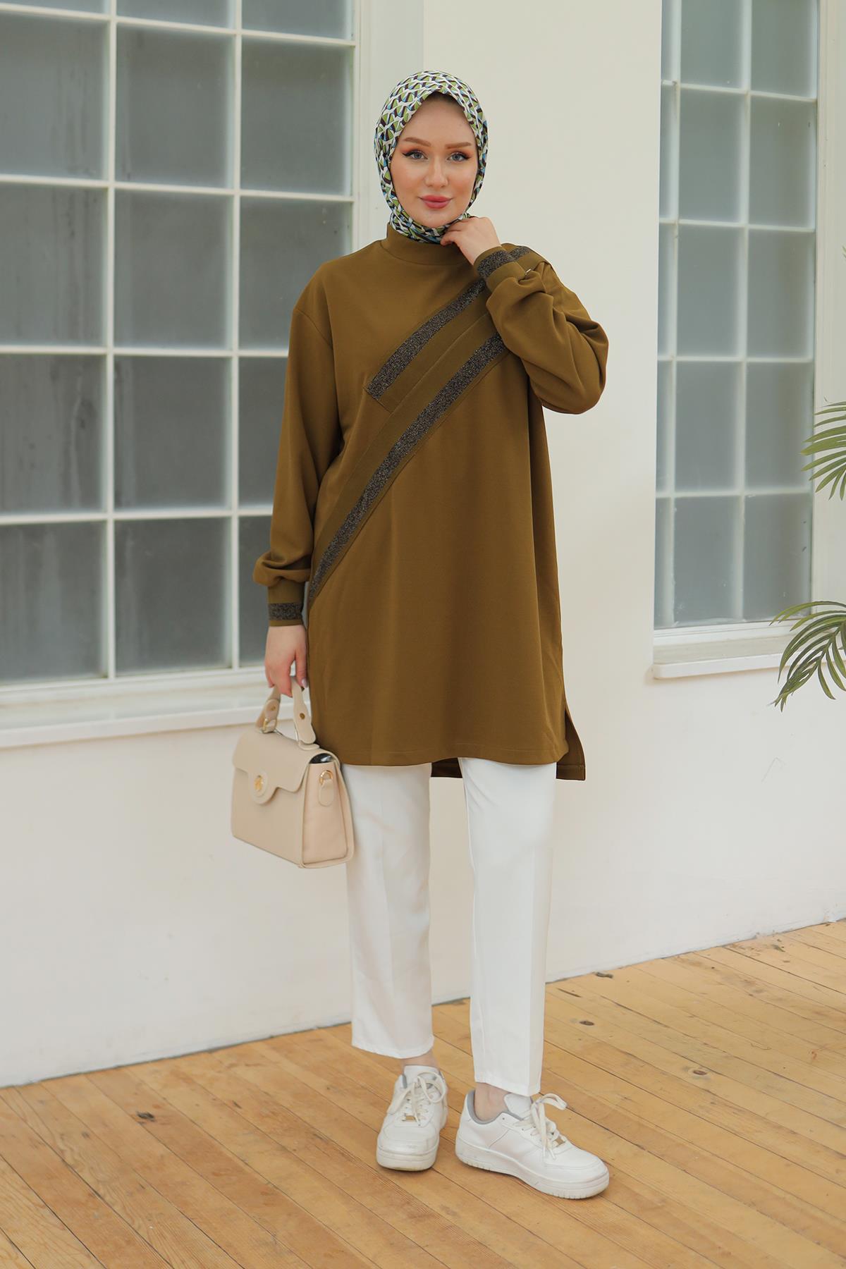 "Şıklığı ve konforu bir arada sunan ARMİNE TREND Kolları Ribanalı Sim Detaylı Tunik, her ortamda dikkat çekmenizi sağlayacak mükemmel bir seçim bu zarif parça, dolabınızda kesinlikle yer almalı!"