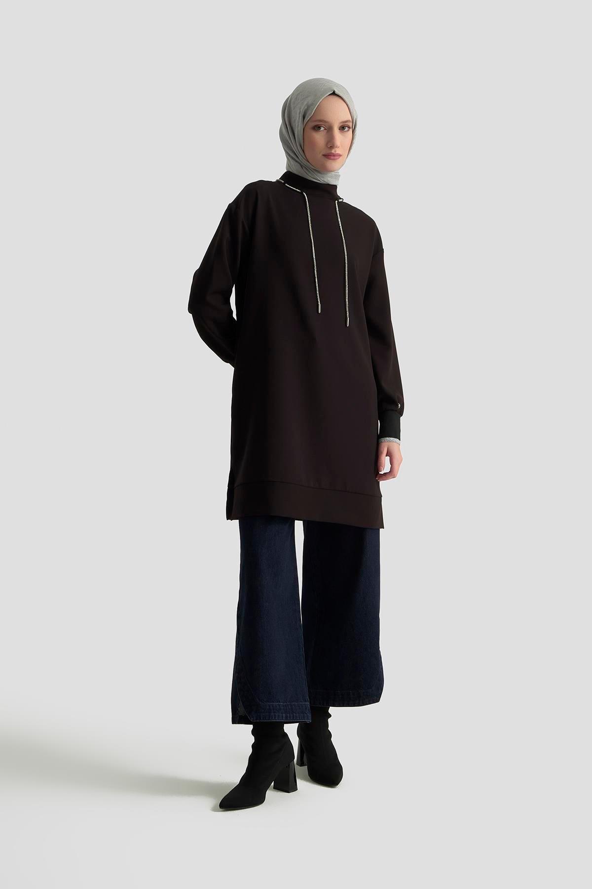 ARMİNE TREND Yakası Taş Bağcık Detaylı Kolları Ribanalı Fermuarlı Tunik Siyah 25KT436